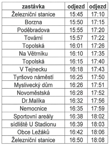 A ještě jednu milou zprávu pro vás máme. V pátek 5. prosince bude městem chodit Mikuláš. Se svojí družinou přijde dokonce i do našeho autobusu v MHD Chrudim. Pojede dvakrát během odpoledne po okružní trase od železniční stanice přes Poděbradovu a Topolskou ulici na Větrník a odtud přes Tyršovo náměstí, Nemocnici a sídliště U Stadionu zase zpět k železniční stanici. Odjezdy jsou v 15:45 a v 17:10 a aby se dostalo na všechny děti, prosíme, pamatujte na to, že kočárky nemůžeme z kapacitních důvodů přepravovat.