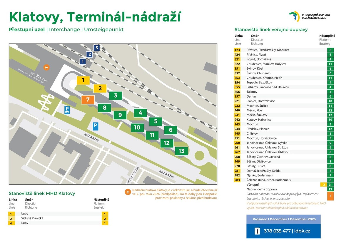Se změnami od neděle 14. prosince počítejte i na Plzeňsku na linkách IDPK. Mezi ty největší patří zprovoznění nového autobusového terminálu v Klatovech, který nabídne u nádraží jednoduché a krátké přestupy mezi vlakem a autobusem. Tím se zlepší i návaznost na rychlíky R16 ve směru Přeštice, Plzeň a Praha nebo Sušice, Horažďovice a Domažlice.