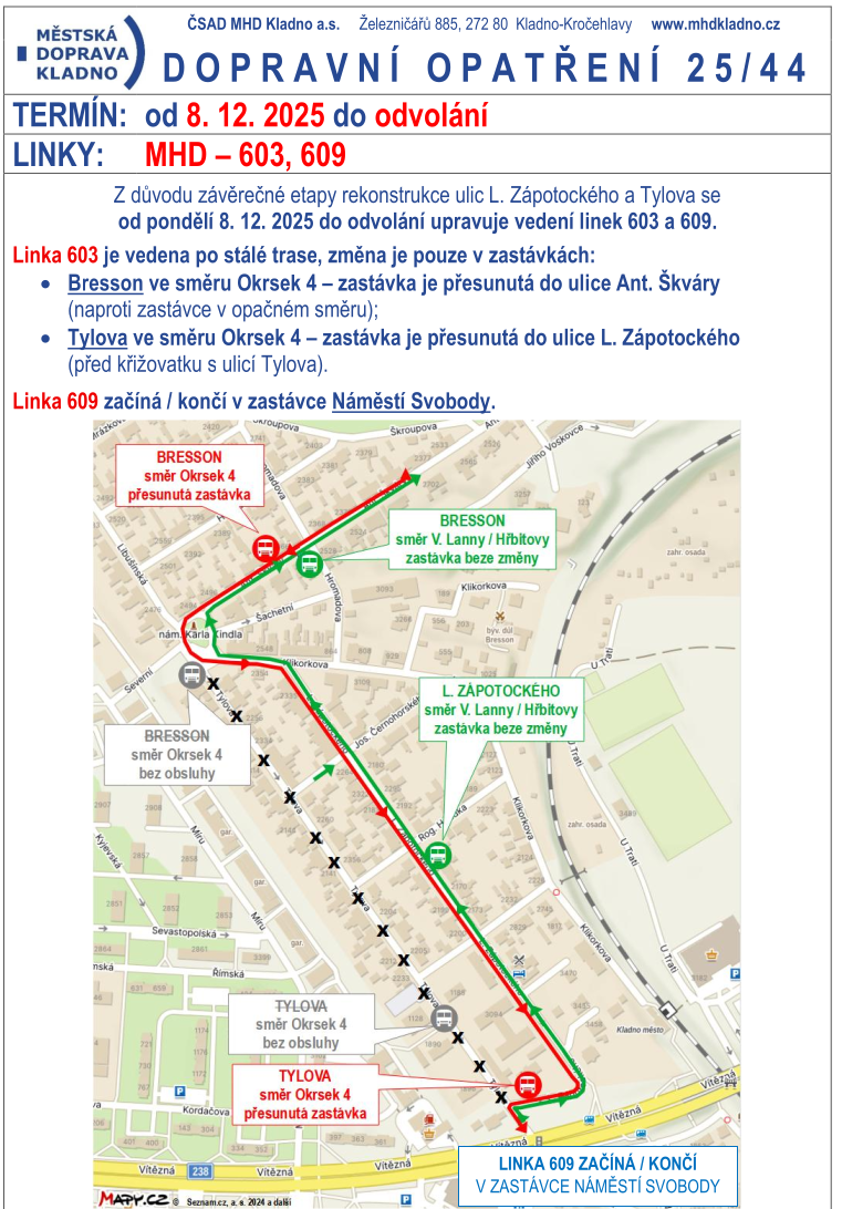 MHD Kladno: Rekonstrukce ulice L. Zápotockého mění linky MHD 603 a 609