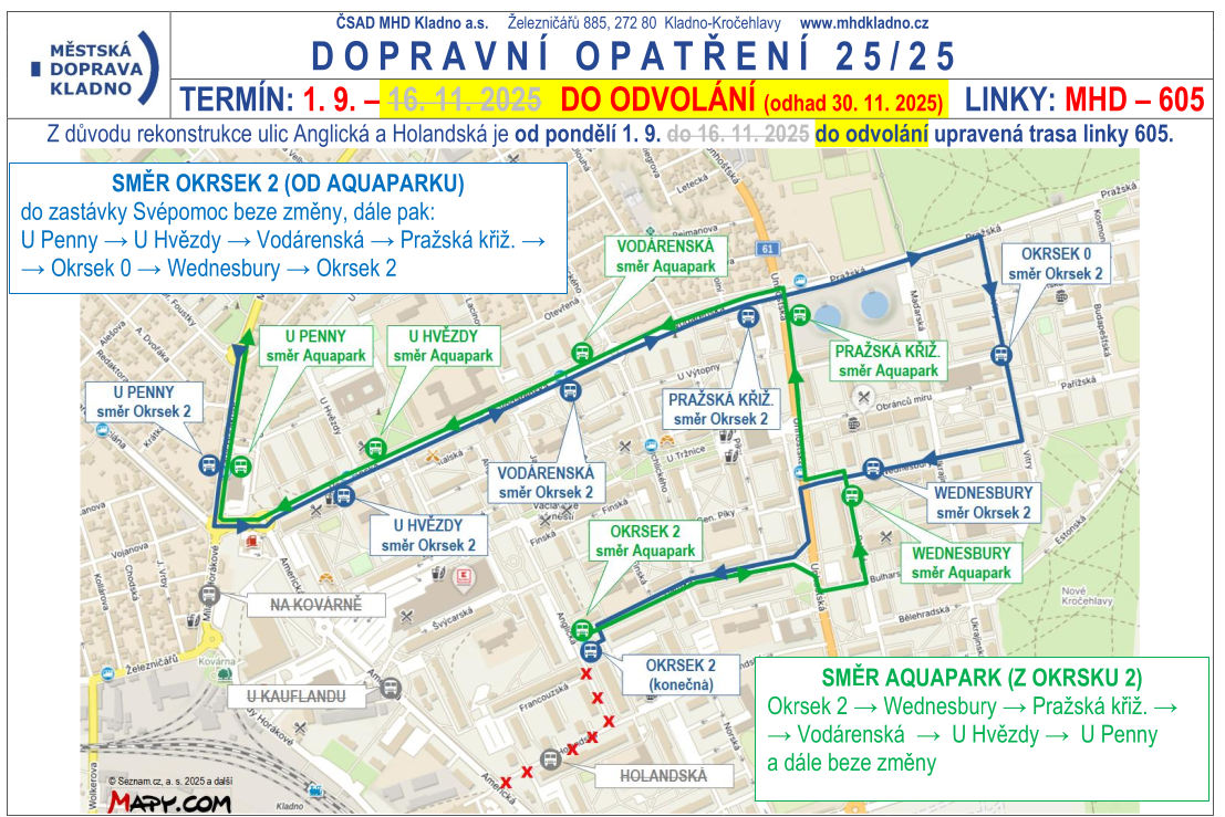 MHD Kladno: Uzavírka ulic Anglická / Holandská mění linku MHD 605