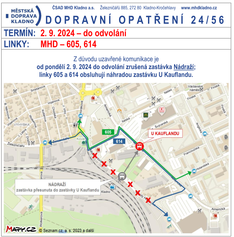 MHD Kladno: Uzavírka ulice ruší zastávku Nádraží a zřizuje náhradní U Kauflandu