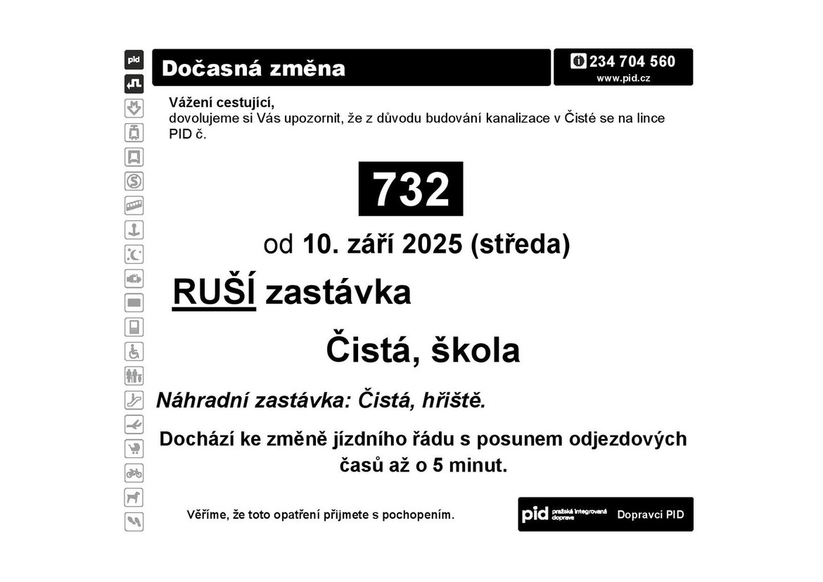 Polohu autobusů můžete zjistit v naší on-line mapě. V případě dalších dotazů kontaktuje infolinku PID 234 704 560. Děkujeme za pochopení.