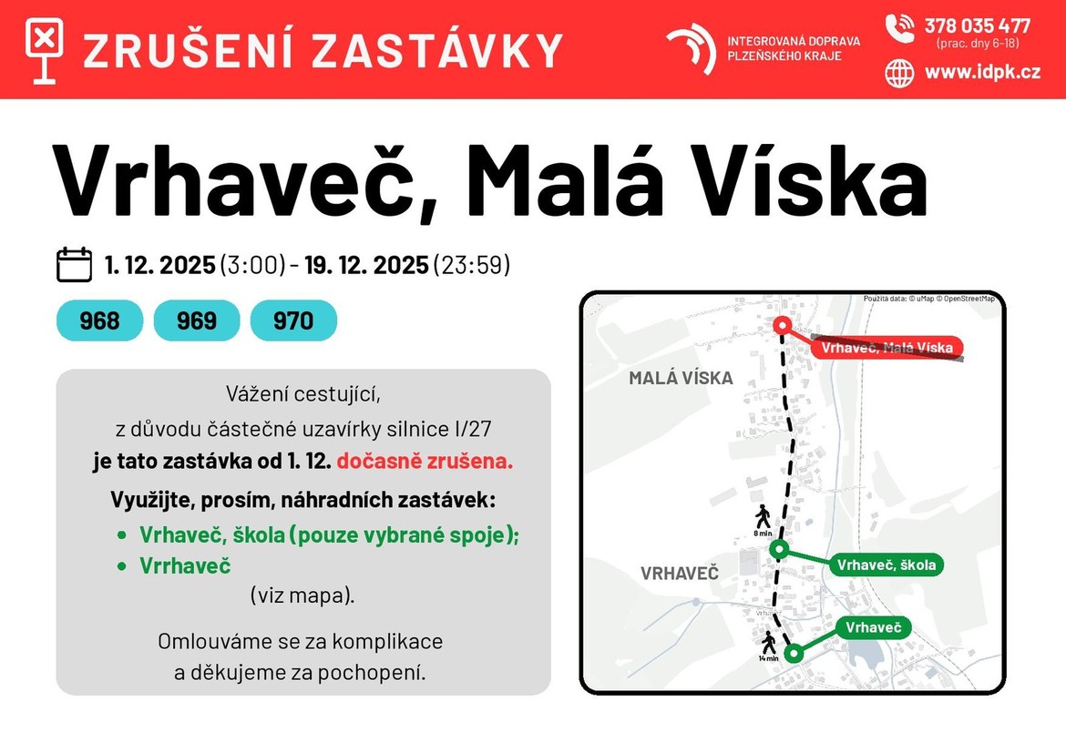 Plzeňský kraj: Omezení na silnici I/27 ruší linkám IDPK zastávku Malá Víska