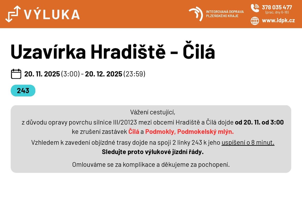 Plzeňský kraj: Uzavírka Hradiště - Čilá mění jízdní řád a zastávky linky IDPK 243