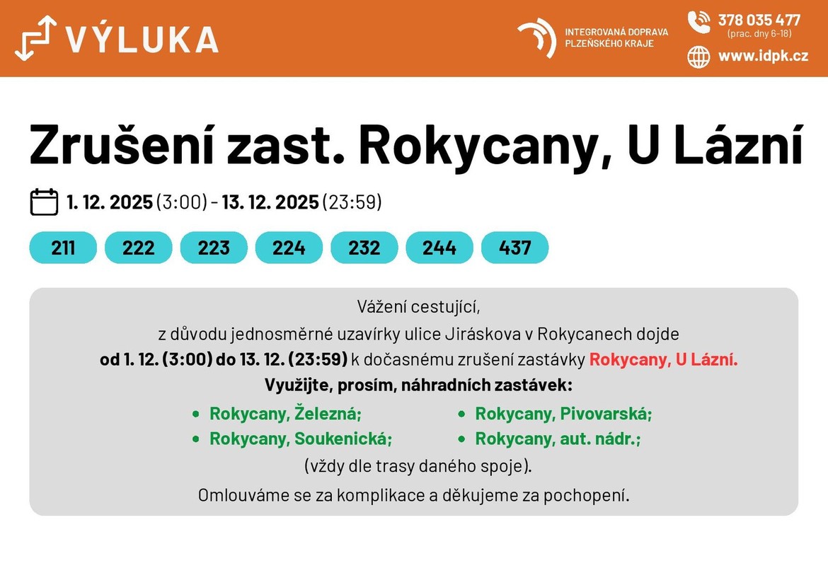 Plzeňský kraj: Uzavírka Jiráskovy ulice ruší linkám IDPK zastávku Rokycany, U Lázní