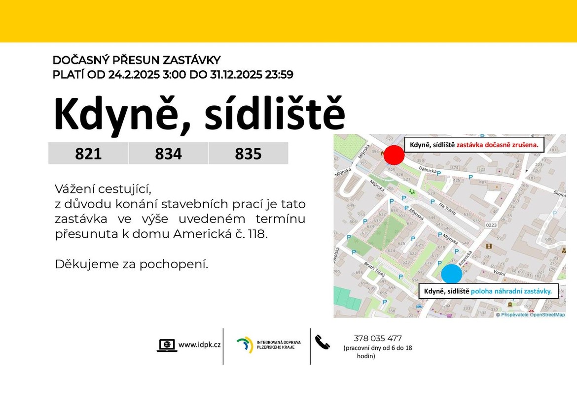 Zastávka Kdyně, sídliště je přesunuta do Americké ulice k domu č. p. 118 a obsluhována bude pouze jednosměrně, zastaví v ní spoje ve všech směrech. Zastávka Kdyně, Na Kobyle je po dobu omezení zrušena, využít můžete zastávku Kdyně, aut. st.