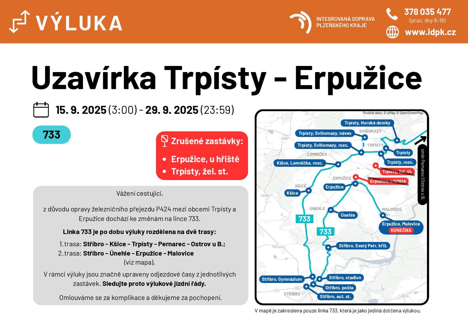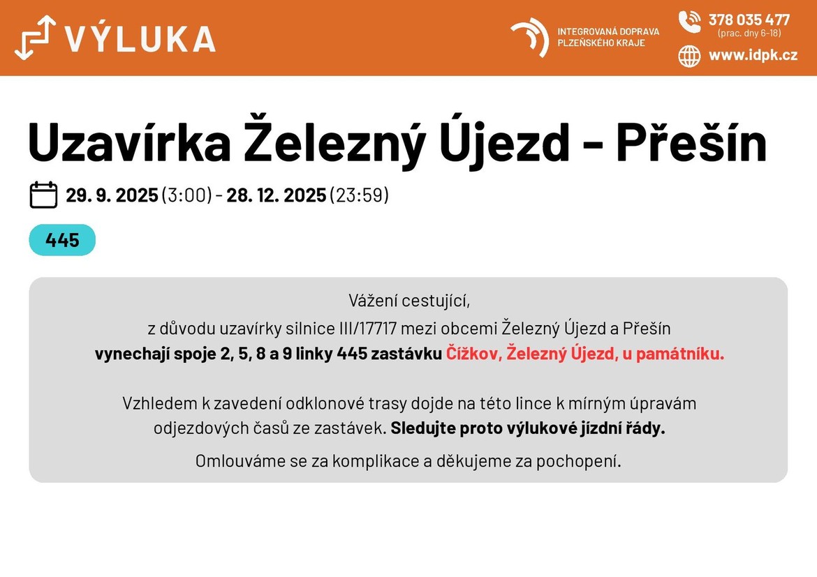 Plzeňský kraj: Uzavírka Železný Újezd - Přešín mění jízdní řád linky IDPK 445