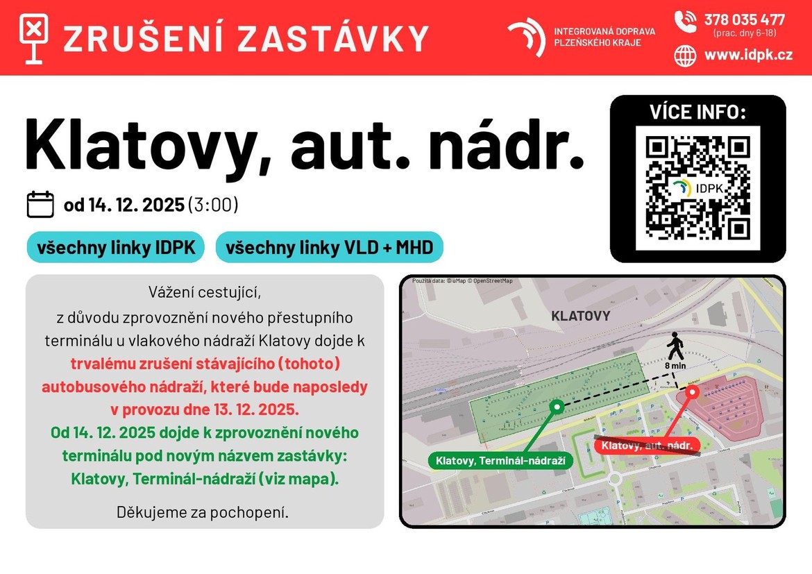 Plzeňský kraj: Ze zastávky Klatovy, aut. nádr. se autobusy přesouvají k nádraží