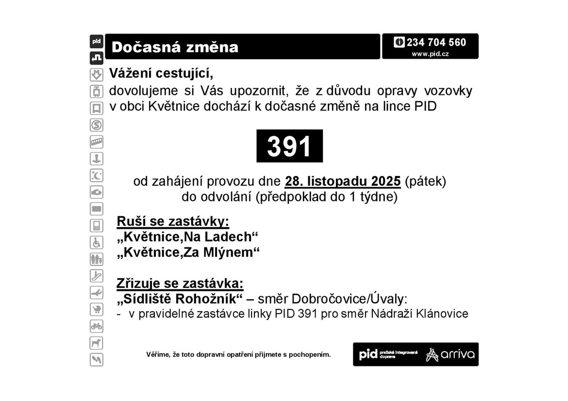 Praha-východ, Kostelecko: Oprava silnice v Květnici mění zastávky linky PID 391