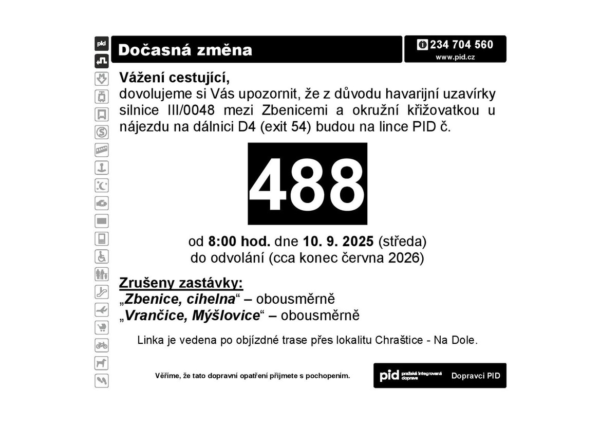 Příbramsko: Havarijní uzavírka silnice od D4 do Zbenic ruší lince PID 488 zastávky