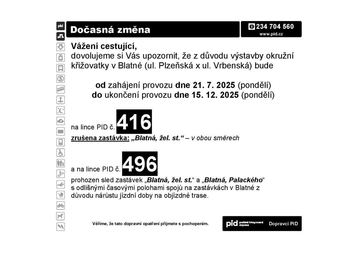 Příbramsko, Strakonicko: Omezení v Blatné mění zastávky linek PID 416 a 496