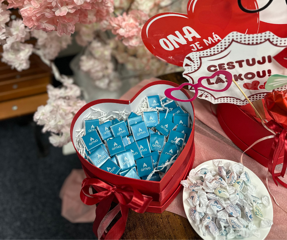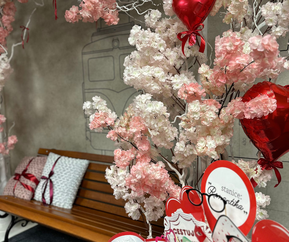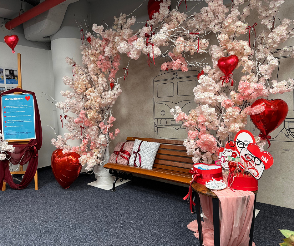 Na valentýnský den lásky jsme připraveni i my v Arrivě. Na hlavním nádraží v Praze jsme pro vás připravili něco speciálního. Až si půjdete do naší pokladny koupit jízdenku pro sebe a svou polovičku, nebo budete společně čekat na vlak, vezměte se za ruku a podívejte se na náš zdejší zamilovaný koutek. V pokladně jsme připravili lavičku pro všechny zamilované a ozdobili ji polštářky, balónky a mašličkami. Nechybí ani květiny, čokolády a nádherný rozkvetlý strom s červenými srdci.