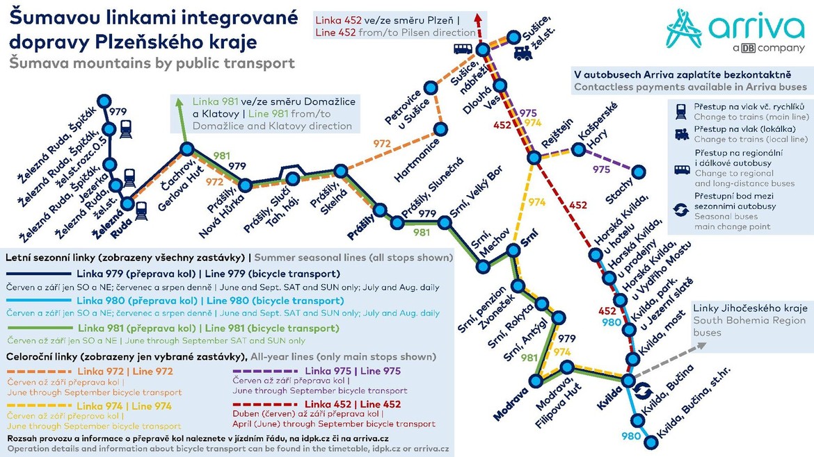 - 972 Železná Ruda, Alžbětín – Prášily – Hartmanice – Sušice: provoz o víkendech od 5. června, max 22 kol;