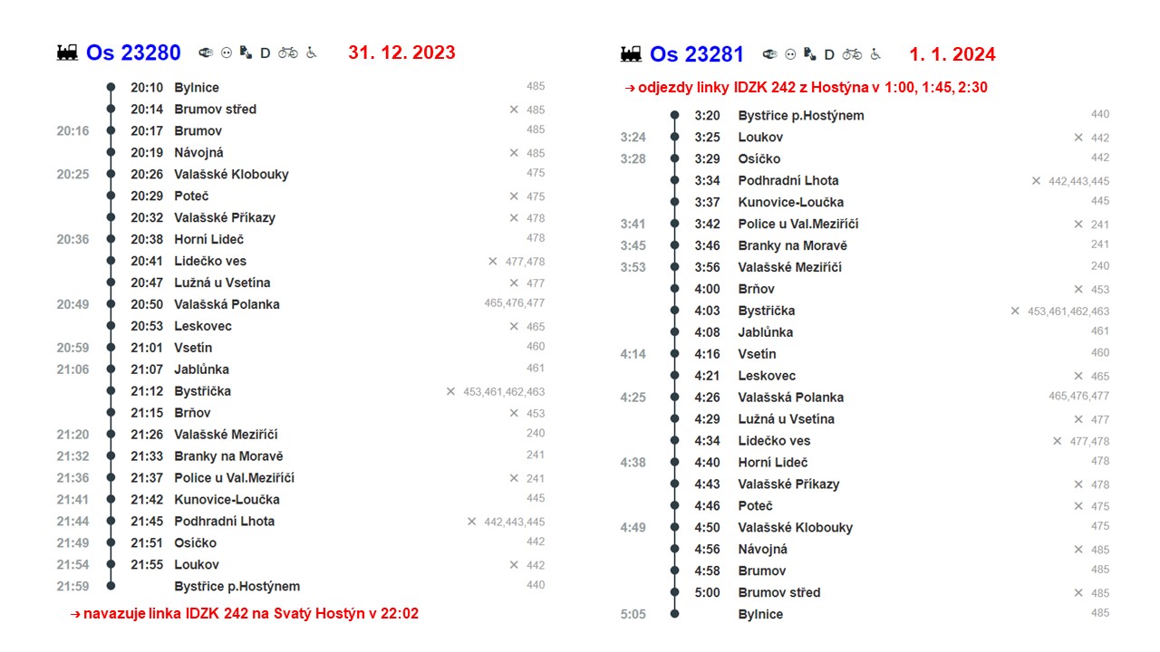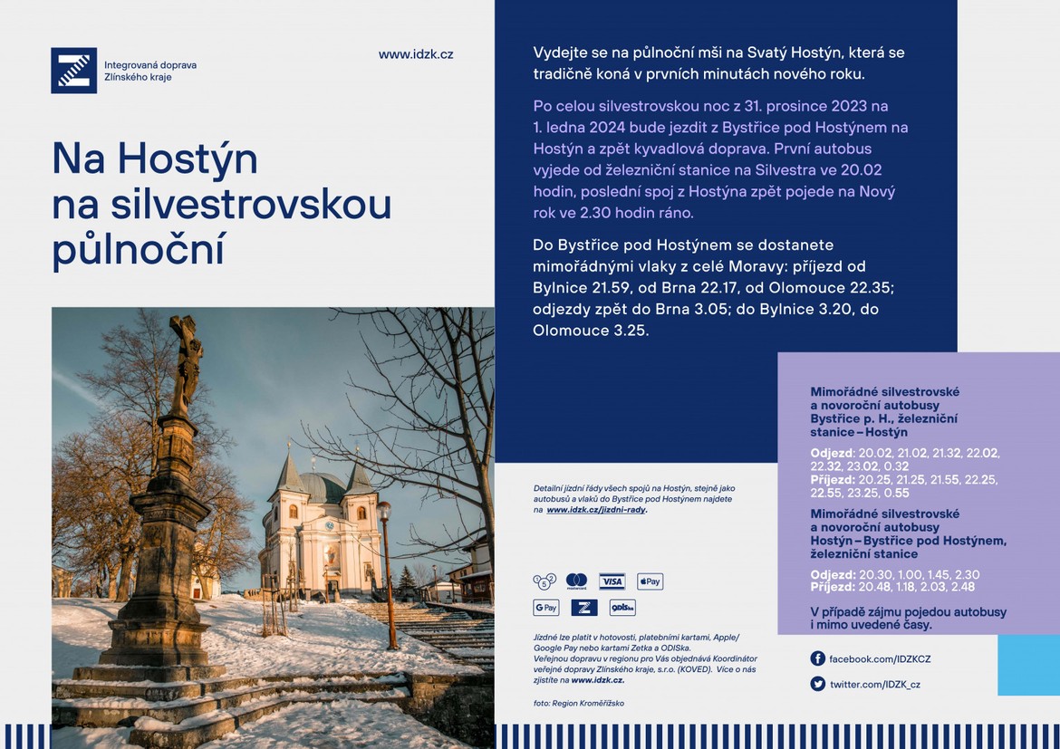 V poslední den roku vyjede večerní nízkopodlažní vlak na trase z Bylnice, Horní Lidče, Valašské Polanky, Vsetína nebo Valašského Meziříčí do Bystřice pod Hostýnem. Přímým spojem usnadníme cestu poutníkům na tradiční bohoslužbu. Z Bylnice vyjíždíme na Silvestra v 20:10, zpět z Bystřice pod Hostýnem jedeme na Nový rok ráno v 3:20. Za dopravu zaplatí podle tarifu IDZK. Přesný jízdní řád.