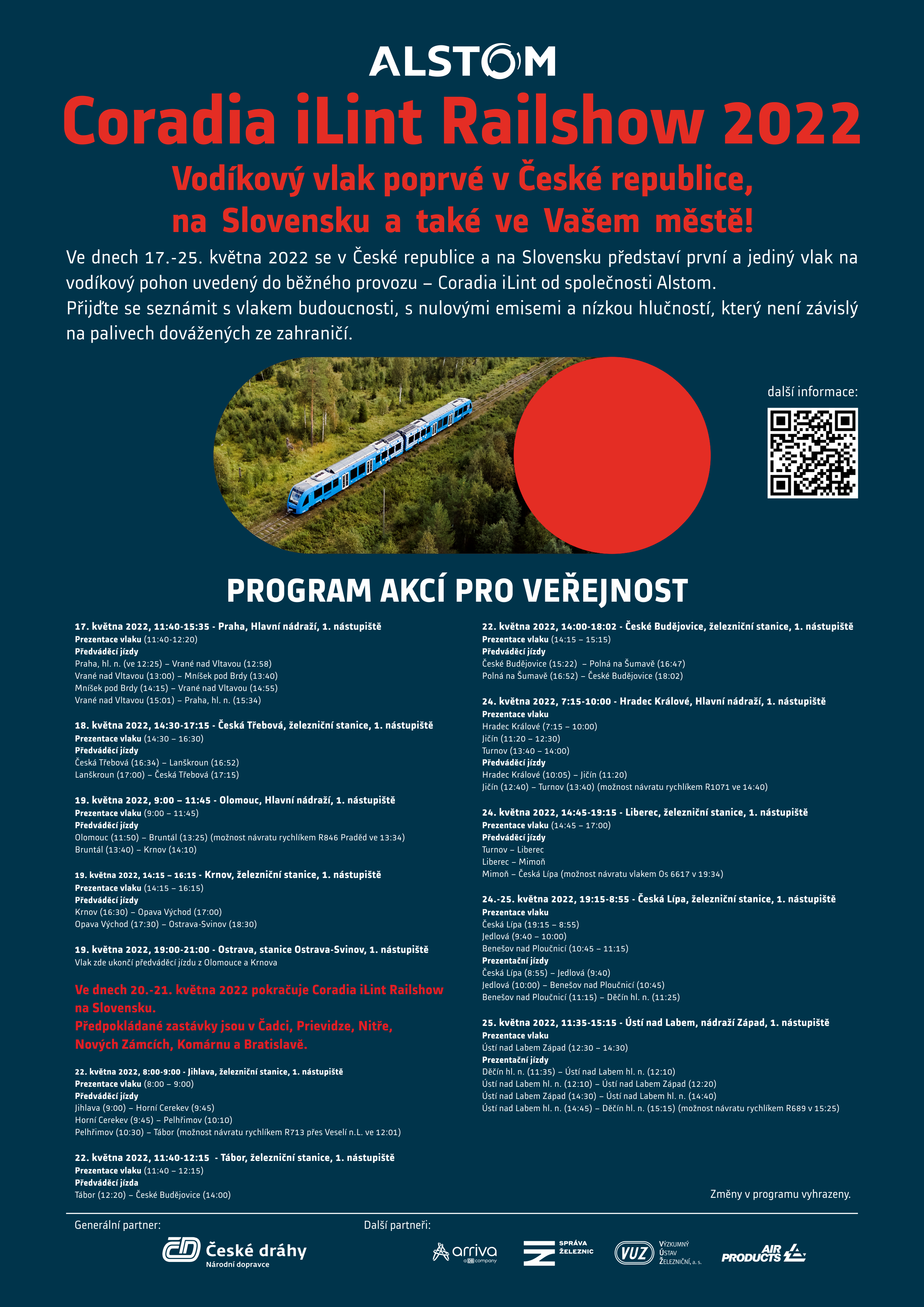 Alstom Coradia iLint Railshow představí toto inovativní a ekologické řešení mnoha regionálním a národním subjektům, ale také českým a slovenským cestujícím. Railshow startuje v úterý 17. května v hlavním městě Praze a pokračuje do dalších regionů České republiky a na Slovensko.