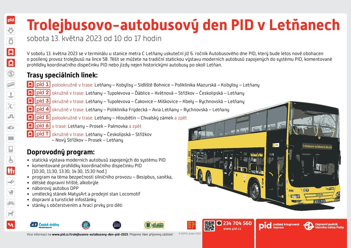 Návštěvníci akce si mohou prohlédnout výstavu autobusů Pražské integrované dopravy jednotlivých dopravců nebo se zúčastnit komentované prohlídky koordinačního dispečinku. Chybět nebudou ani jízdy historických nebo netradičních autobusů na sedmi linkách, které z Letňan vyjedou a posílen bude provoz trolejbusové linky 58.
