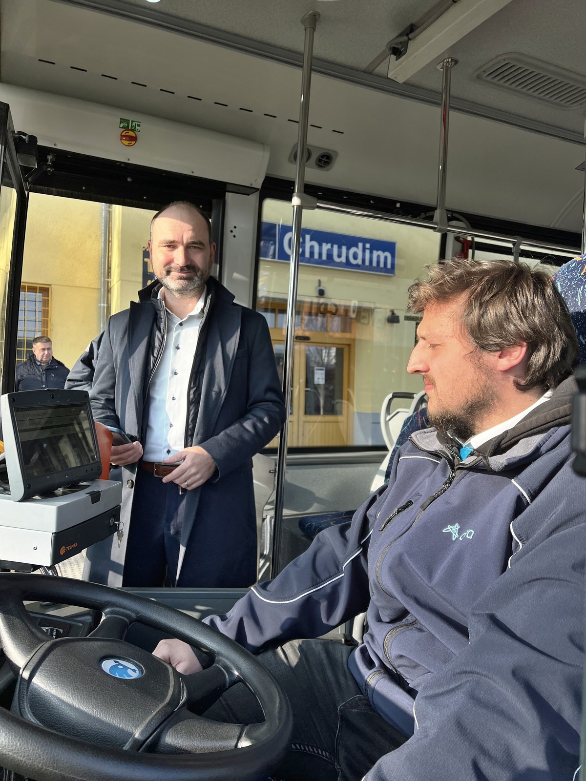 Zánovní bílý autobus s výraznými polepy chrudimské městské dopravy vozí cestující na všech zdejších linkách, nejčastěji je ale do cíle doveze na linkách 1 a 3, kromě centra města obsluhuje třetí linka i Markovice. Autobus jsme slavnostně se zástupci města uvedli do provozu v úterý 7. února.