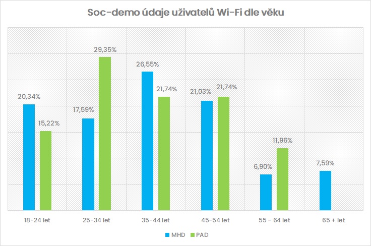 WiFi připojení v našich autobusech příměstské dopravy využívají ženy a muži téměř rovnoměrně. Největší procento uživatelů internetu jsou cestující ve věku 34 až 44 let a od 45 do 54 let. Zajímavá je také skupina starších cestujících ve věku nad 65 let, která tvoří téměř 12 % z celkového počtu připojených v autobusech příměstské dopravě, v MHD se připojují lidé 65+ téměř v 8 %.