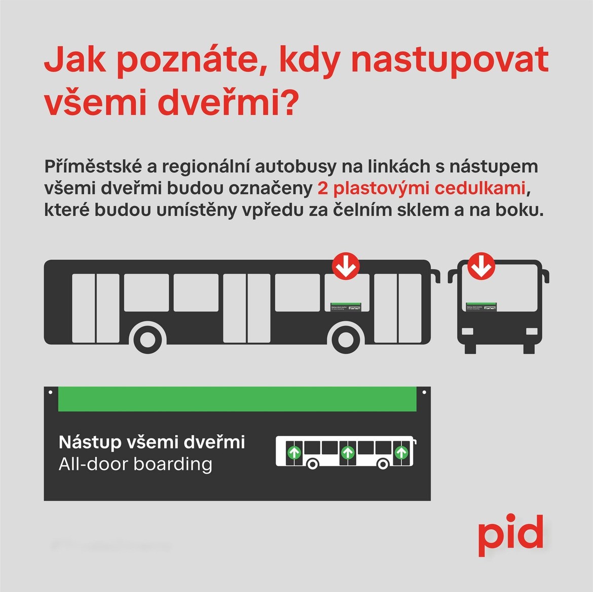 Jak poznáte, že můžete nastoupit všemi dveřmi? Informace bude uvedena v jízdních řádech na zastávkách, ve vyhledávačích spojení a také v mobilní aplikaci PID Lítačka. V přední a boční části autobusu bude viditelná informační tabulka.