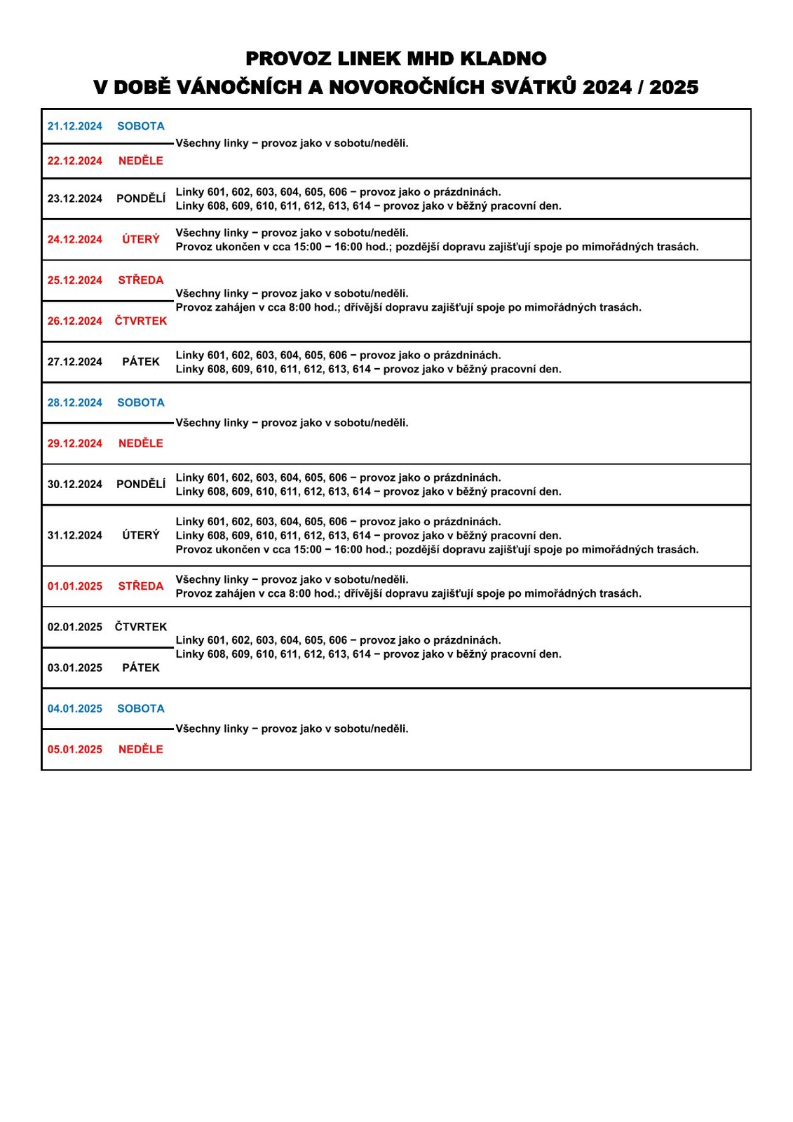 Upraven je také provoz linek MHD Kladno, ve svátečních dnech 24., 25., 26., 31. prosince a 1. ledna vyjedou speciální linky s označením X a vzájemným přestupem ve stanici Náměstí Svobody. Upravena je také provozní doba všech tří zdejších informačních kanceláří. Během vánočních svátků jsou mimo provoz naše informační kanceláře v Čáslavi, Chrudimi a Trutnově. Od 20. 12. 2024 do 31. 12. 2024 jsou uzavřené, v provozu budou opět v novém roce.