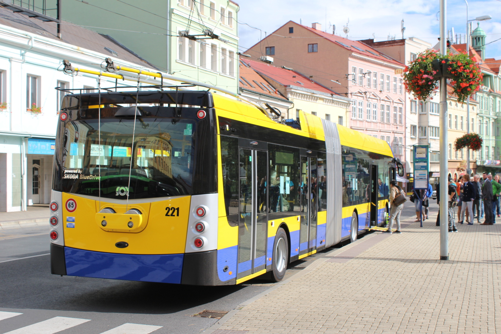 Na teplických linkách jezdí žlutomodrý trolejbus.