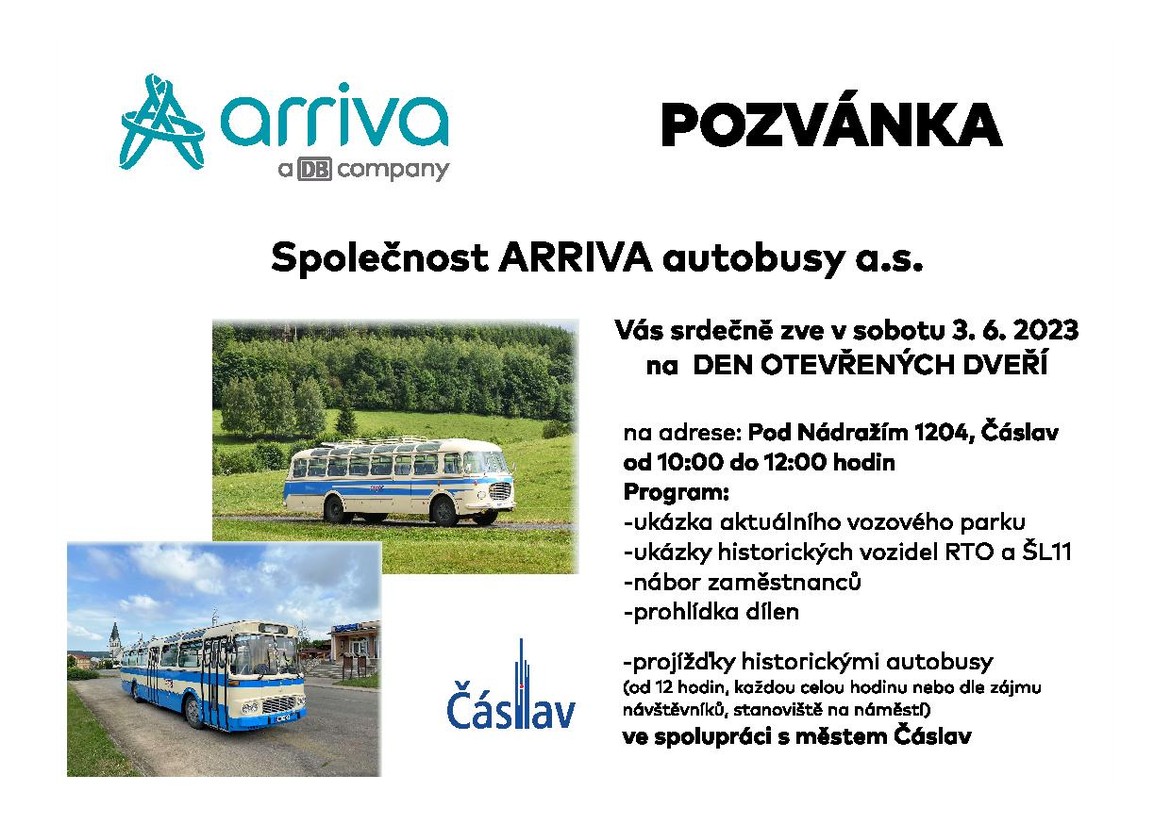 Na sobotu 3. června si udělejte velký puntík do kalendáře, nebo si v telefonu založte pro tento den upomínku do ní si napište: Arriva v Čáslavi má den otevřených dveří.