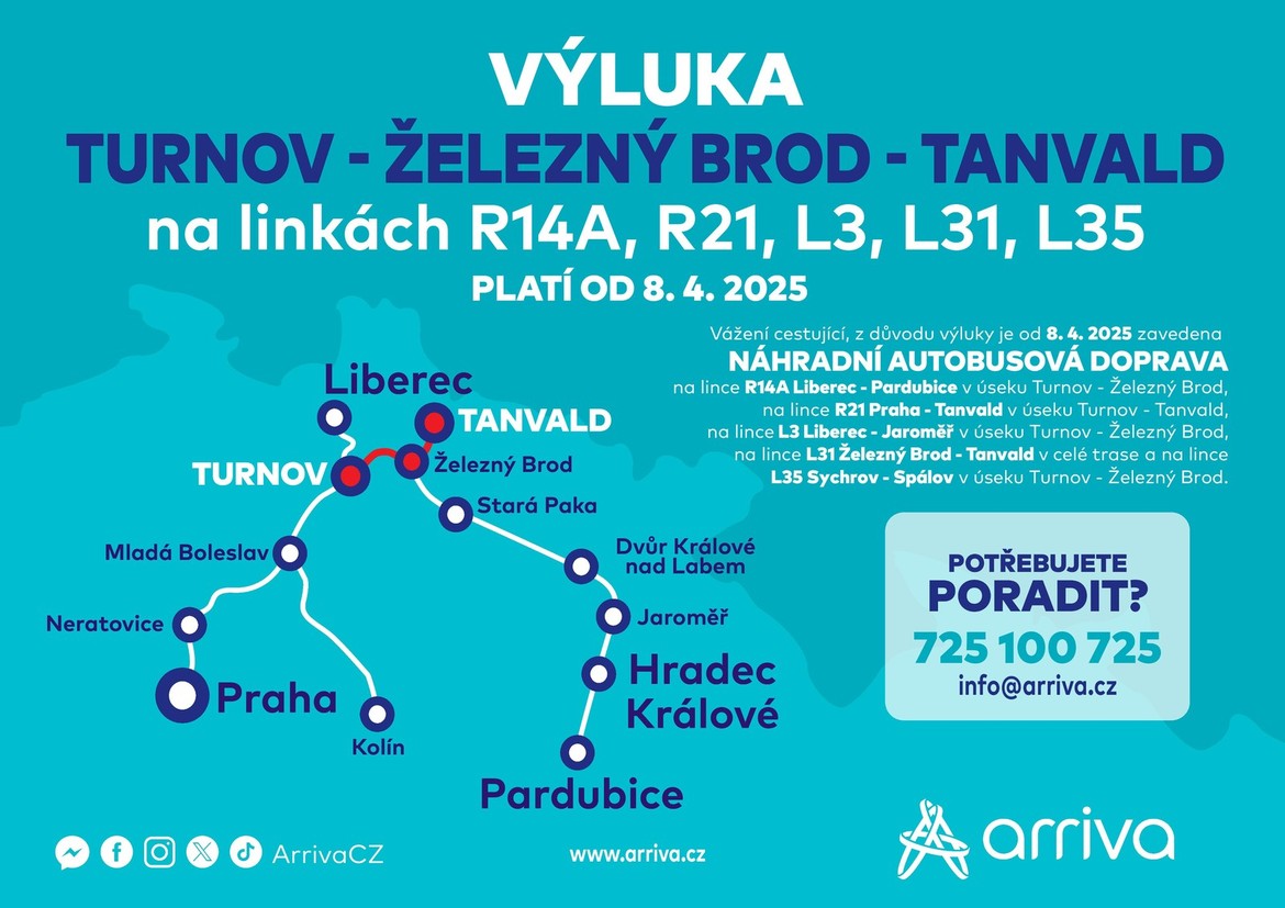 Na linkách R14A Liberec – Pardubice a L3 Liberec – Jaroměř pojedou náhradní autobusy v úseku mezi Turnovem a Železným Brodem. Za rychlíky R21 z Prahy do Tanvaldu vypravíme dvě náhradní autobusové linky v trasách Turnov – Železný Brod – Tanvald a Železný Brod – Jesenný pro zajištění spojení do Spálova a Jesenného. Na „doplňkové“ linky do těchto obcí můžeme nasadit jen malokapacitní autobus a přepravu větších skupin je proto potřeba dopředu nahlásit na naší zákaznické lince 725 100 725. Linka L31 z Železného Brodu do Tanvaldu bude zajištěna v celé trase náhradním autobusem a stejně jako u R21 bude zajištěna samostatná doprava pro Spálov a Jesenný „malým vozem“. Sezonní linku L35 budeme zajišťovat jen do Železného Brodu.
